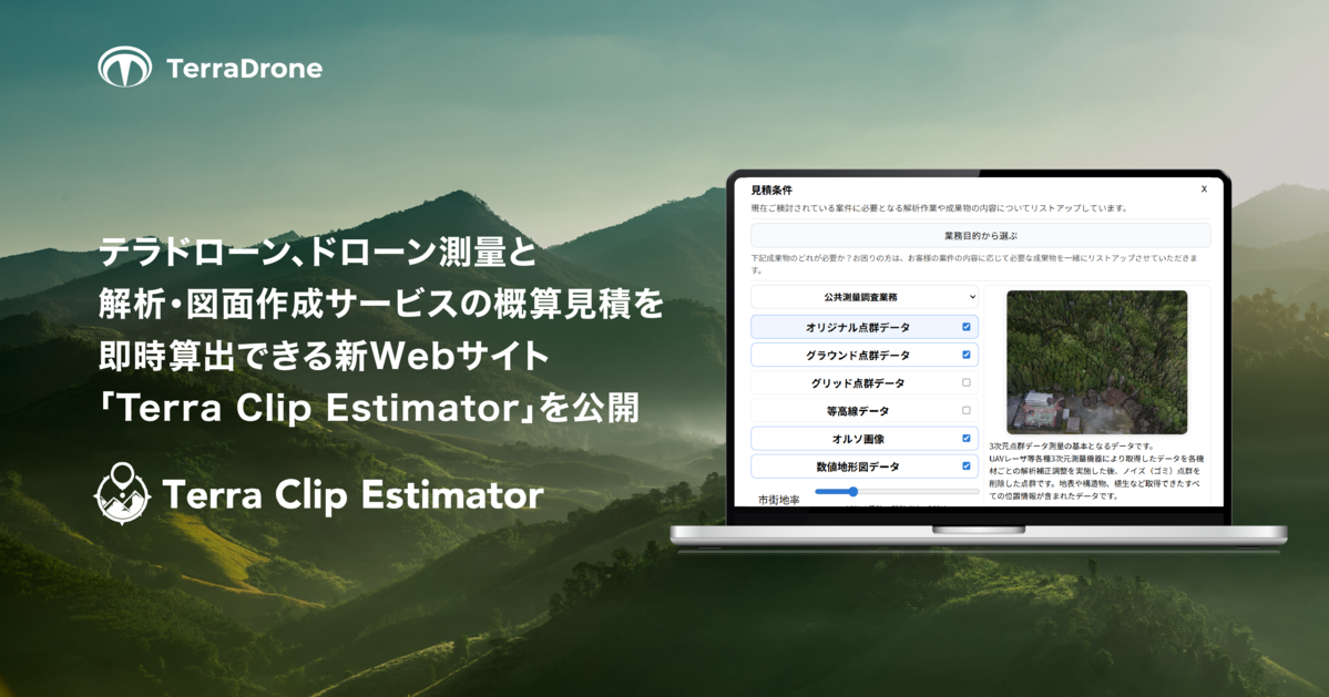 テラドローンより、ドローン測量と解析・図面作成サービスの概算見積を即時算出できるWebサイト「Terra Clip Estimator」が公開されました。