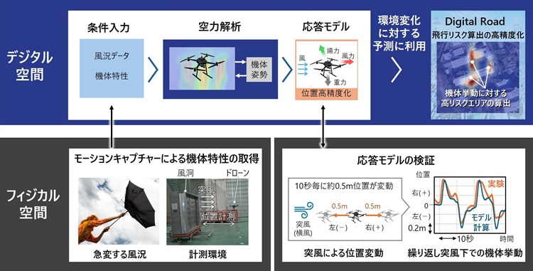 機体ごとの耐風性能を測定し、機体応答をモデル化するとことで、機体の位置変動などの挙動をデジタル空間内で検証し、飛行リスクを調べることができます。