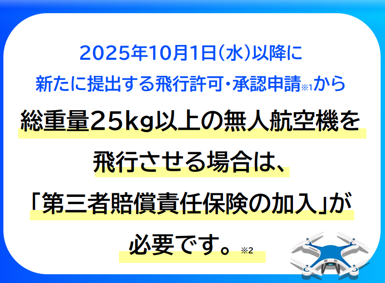 国土交通省より、2025年10月1日から、総重量25kg以上の無人航空機を飛行させる場合は、第三者賠償責任保険の加入が必要になると発表がありました。